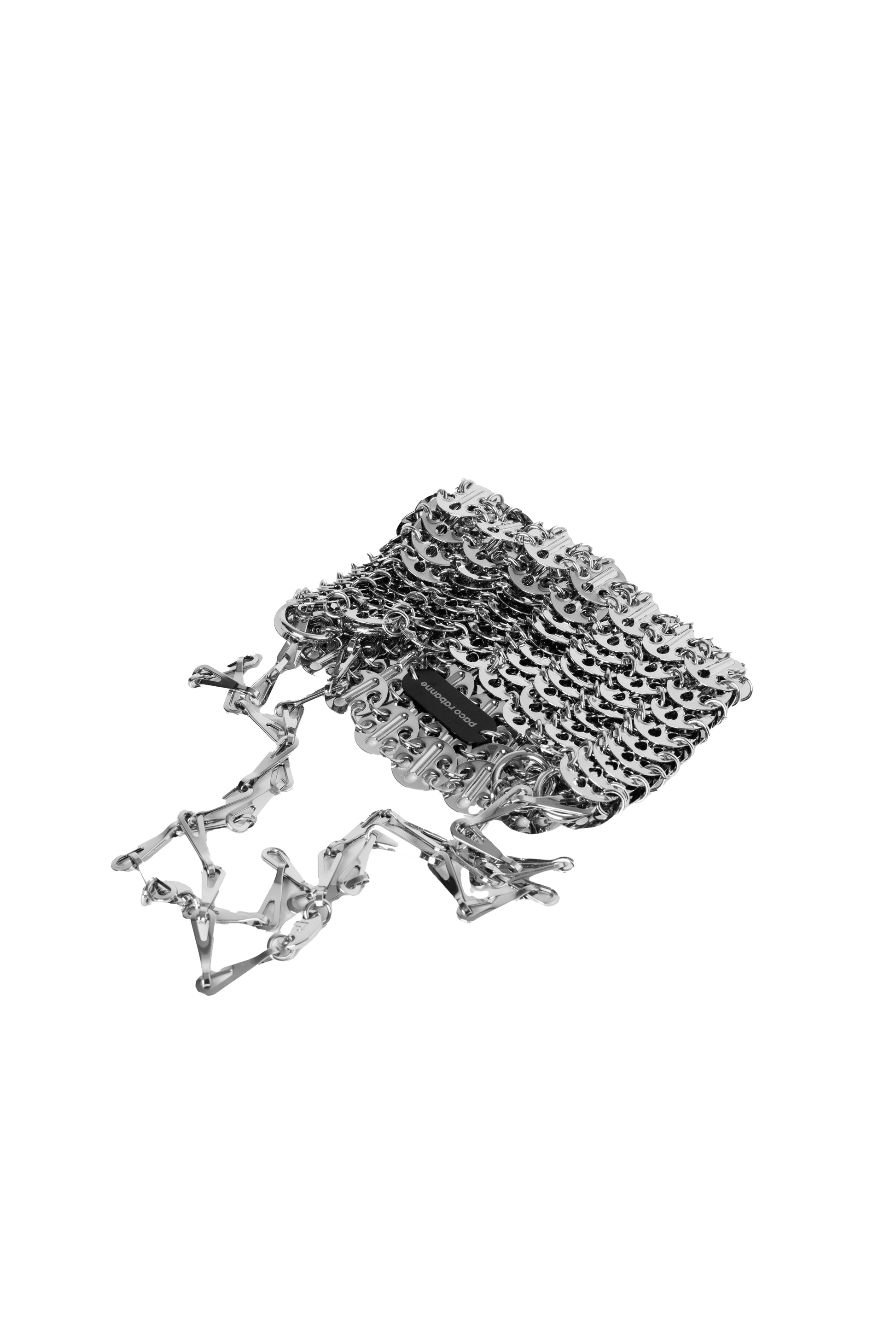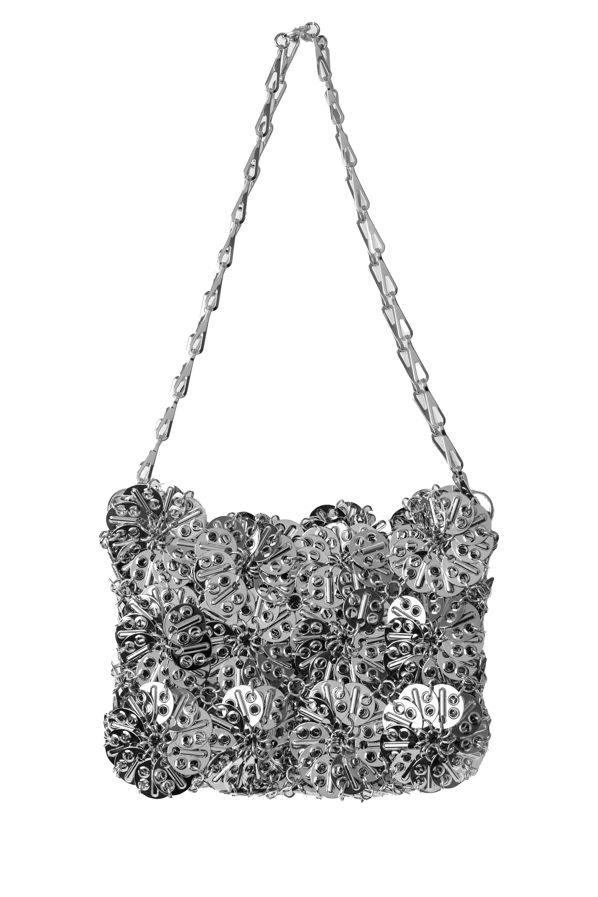 The Paco Rabanne Metal-Disc Shoulder Bag features a unique construction of metal discs, showcasing the brand's innovative and unconventional approach to design.